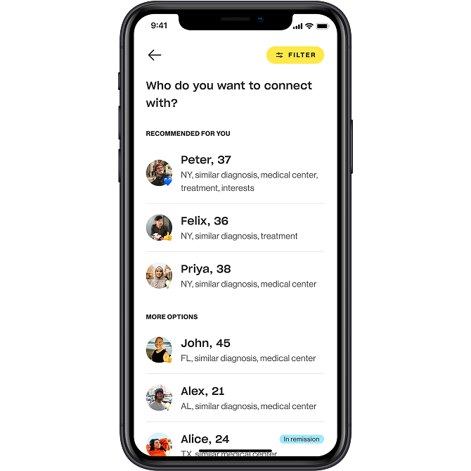 People facing any cancer can be matched with others by diagnosis, treatment, side effects, age, interests, hospital, city or state, and more.